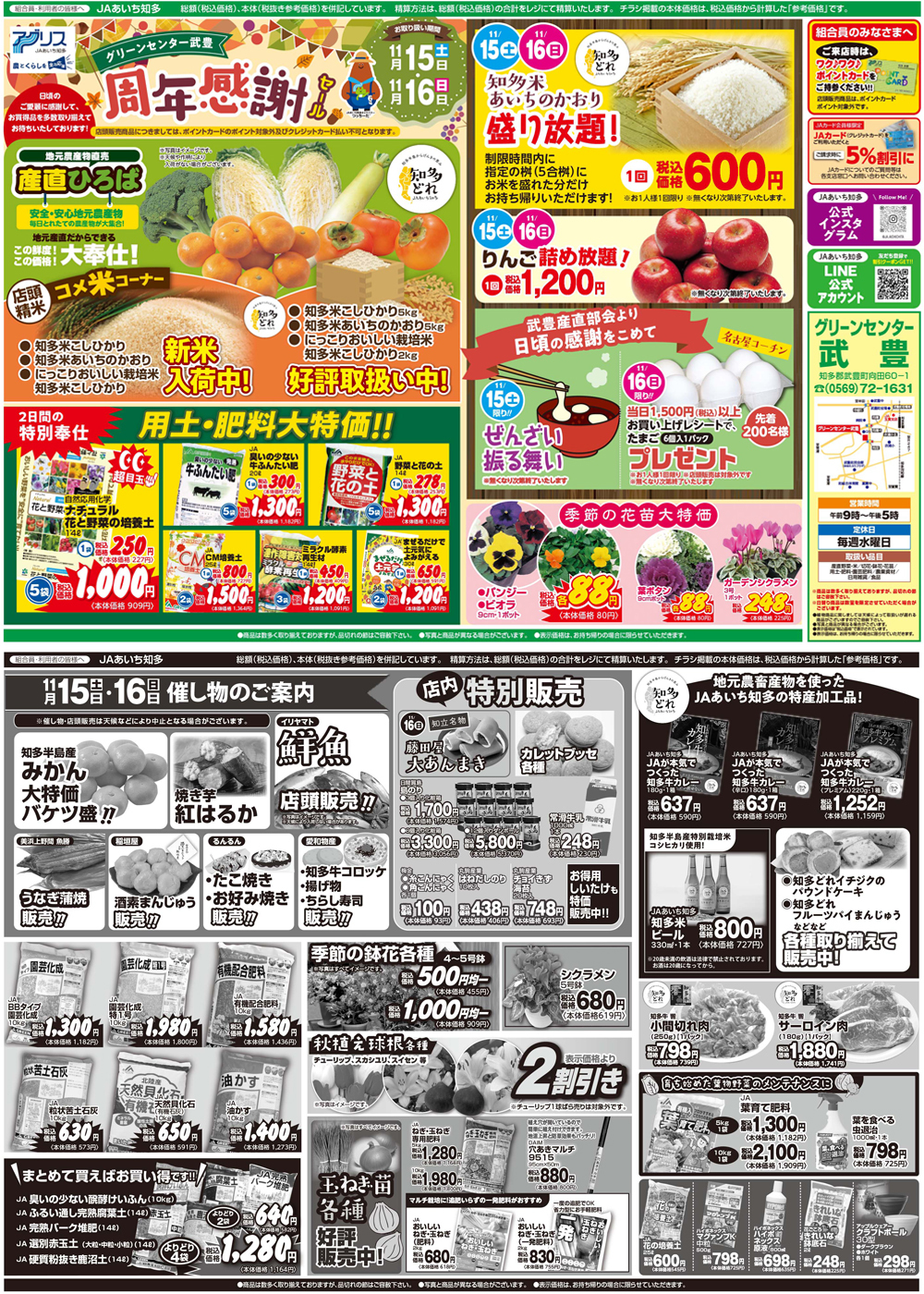 令和7年11月15日(土)~令和7年11月16日(日)の2日間、グリーンセンター武豊では周年感謝セールを開催します。ぜひご来店ください。