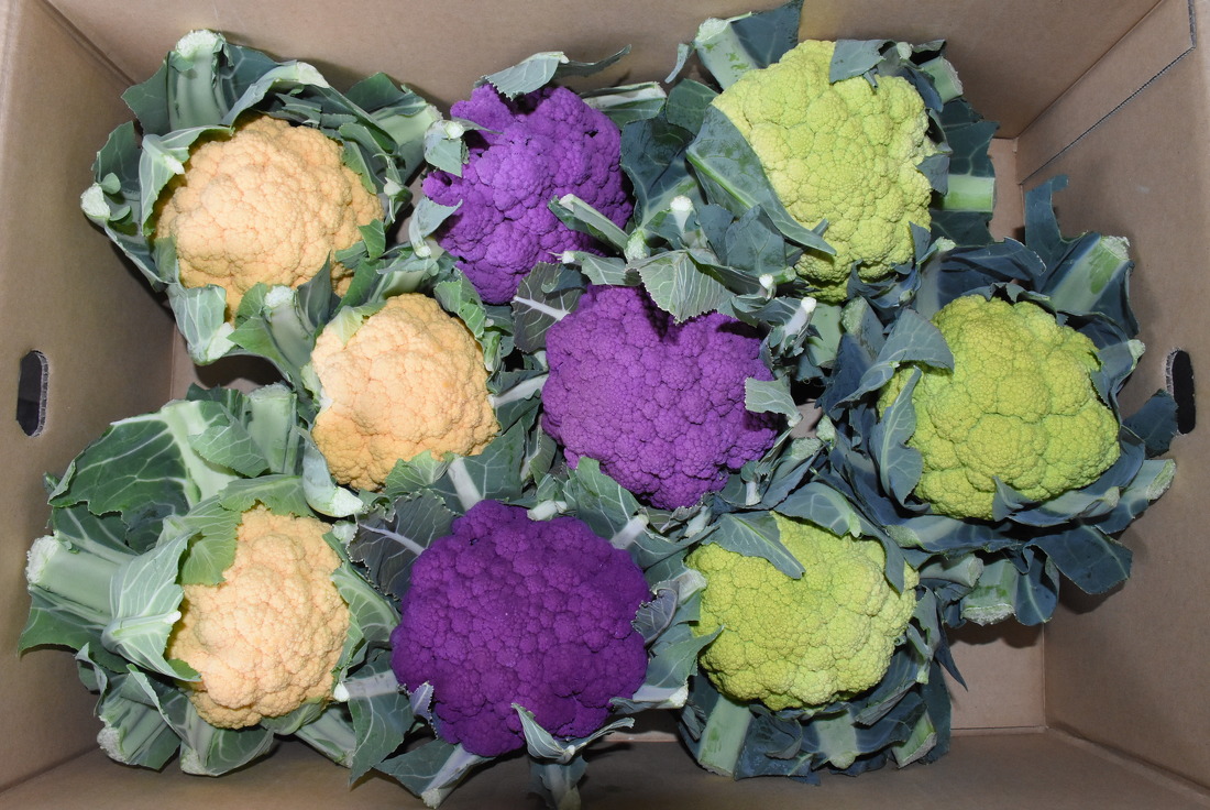 東海市、知多市などで栽培されているカリフラワーは約8割が一般的な白色のカリフラワーですが、約2割はオレンジ色や紫色をしたカラフルなカリフラワーです。