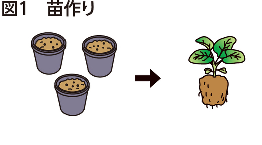 直径7・5~9cmのポリポットを使い1ポット当たり4~5粒をまき、子葉展開時に密生部を間引き、本葉2~3枚で1株に間引き、本葉5~6枚まで育てます。128穴のセルトレイでは1穴2粒まき、間引いて本葉3~4枚まで育てます(図1)。育苗期間中は、防虫ネットのトンネル被覆で害虫の飛来を防ぎます。