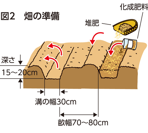 植え付け2週間前に、1㎡当たり苦土石灰100gをまいて、深く土を耕しておきます。1週間前に畝幅70~80cm、深さ15~20cmの溝を掘り、この溝1m当たり化成肥料(NPK各成分10%)100g程度と堆肥2kgを施し、土を戻してよく混ぜて畝を作ります(図2)。