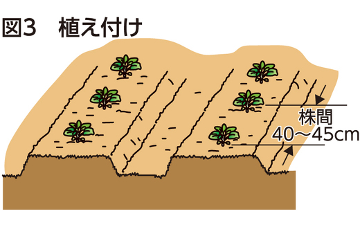 本葉5~6枚の頃、株間40~45cm程度に植え付けます(図3)。植え傷みが起こらないように、植え穴には十分水を注いでおきましょう。