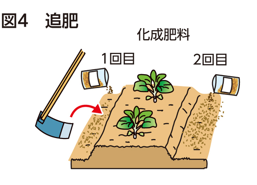植え付け20日後ごろに畝の片側に化成肥料を畝1m当たり50gくらいまいて、土寄せします。その20日後ごろに畝の反対側に同量を施用します(図4)。