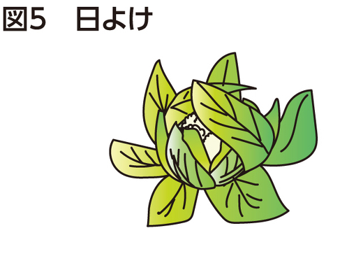 花蕾が見えたら、花蕾に日焼けや汚れが付かないように、外葉の1~2枚を内側に折って花蕾に載せます(図5)。