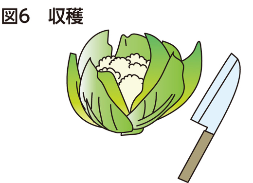 花蕾が12cm以上の大きさになり、つぼみの表面が緻密なうちに、外葉を6~7枚付けて切り取ります(図6)。