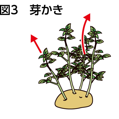 芽が10cmくらいに伸びた頃、強い芽を2本残して他はかき取ります(図3)。