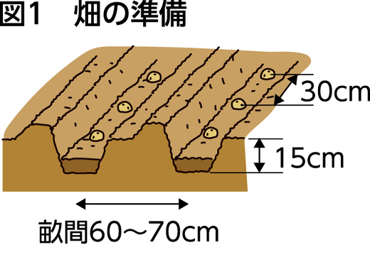 植え付け2週間前に1㎡当たり苦土石灰50gを施しよく耕し、1週間前に、畝間60~70cm、深さ15cmの溝を掘り、畝1m当たり普通化成肥料100gと堆肥1kg程度を施し、土を戻してよく混ぜておきます(図1)。