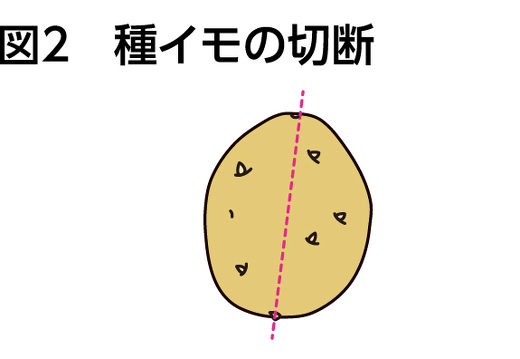 ]種イモの大きさは1個30gくらいが良く、大きいイモは各片に頂部に芽が付くように3~4片に縦切りします(図2)。切り口は、日陰で短時間乾かしておきます。元肥の上に少し土を戻し、種イモの切り口を下にして、株間30cmに植え付け、7~8cmの覆土をします。マルチ栽培をすると雑草を防ぎ、地温が上がるため収穫期が1週間程度早まります。この場合、種イモを植え付け後、黒色ポリフィルムを張り、芽先がフィルムを持ち上げたら、フィルムを破り上に出します。なお、発芽後の遅霜被害対策として、不織布のべた掛けがお勧めです。