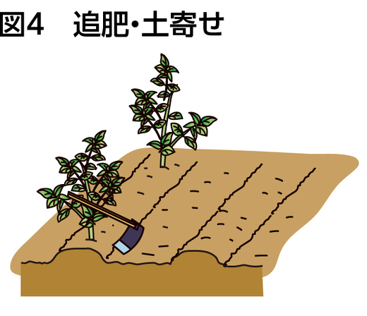 芽が15~20cmの頃、畝1m当たり普通化成肥料50gを畝の両側にまき、5cm程度の厚さに土寄せをします。2回目の土寄せは同じようにつぼみが付いた頃に行います。土寄せは十分し、イモの露出を防ぎます(図4)。マルチ栽培ではマルチの裾を上げて追肥をします。