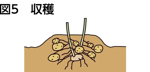 開花後2~3週間で新ジャガを楽しめますが、葉が枯れ始めてから掘り取れば充実したイモになります。晴天が続いた日にイモを傷付けないように掘り取ります(図5)。イモは光で緑化するため冷暗所で保存します。