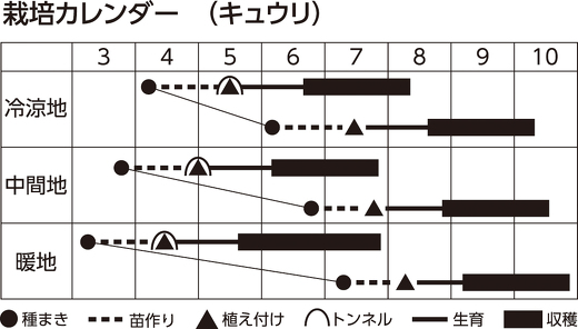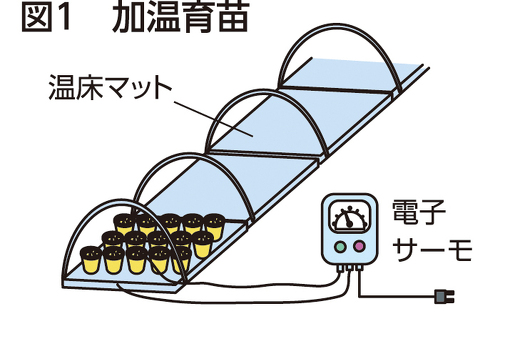 植え付け時期から逆算しておよそ30日前に、加温された9cmポリポットに3粒ずつ種まきします(図1)。発芽したら30度以上にならないように換気し、本葉1本の頃に間引いて1本立ちにし、本葉4、5枚まで育苗します。加温育苗しないときは、5月上旬から中旬ごろが種まき時期です。購入苗はつる割れ病に強い接ぎ木苗を選びましょう。