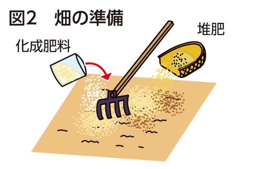 植え付け2週間前までに1㎡当たり苦土石灰200gをまき、土と混ぜておきます。次に、1週間前に化成肥料(NPK各成分10%)200g、堆肥2、3kgを予定した畝幅に散布し、よく耕しておきます(図2)。土壌水分が適度のときにマルチを張り、地温を上げておきます。