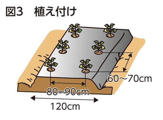 中間地では遅霜の心配がない5月上旬から中旬、トンネル栽培の場合は4月中旬から下旬ごろが植え付け時期です。栽植方法は、2条植えでは畝幅120cm程度、条間80~90cm、株間60~70cmにします(図3)。