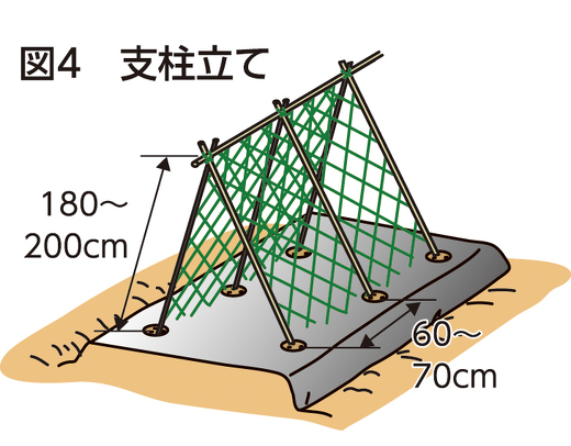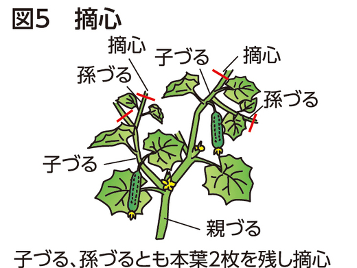 植え付け時は仮支柱を立て、ひもで緩く縛ります。次に、つるが伸びだす前に支柱を用意し、合掌式に支柱を組みます。そして、支柱にキュウリネットを張り、つるをネットに誘引します(図4)。親づる(主枝)の下から5、6葉までの子づると雌花は、全て早めに摘み取ります。その後の子づる、孫づるは2葉を残して摘心し、親づるは支柱の高さで摘心します(図5)。