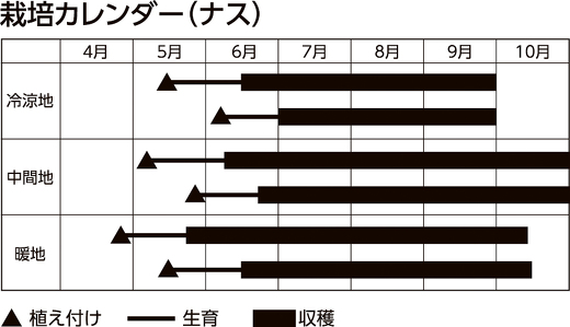 ナスのふるさとは、日照量が多く高温のインドです。夏の酷暑でも適切な管理を行えば、夏から秋まで長く収穫を楽しめます。煮る、焼く、揚げる、漬けると用途は多様です。「ナス紺」と呼ばれる色素はアントシアニンの一種で、活性酸素を抑制し、血管をきれいにする効果があります。