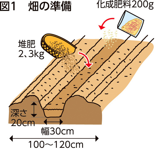 植え付け2週間前に1㎡当たり苦土石灰100gをまいて耕しておきます。1週間前に幅100~120cmの栽培床を作り、中央に深さ20cmの溝を掘り、溝1m当たり化成肥料(NPK各成分10%程度)200gと堆肥2、3kgを施し、よく混ぜておきます(図1)。
