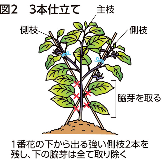 植え付けと同時に仮支柱を斜めに挿し、株を支えます。1番花の下から出る勢いの良い2本の側枝を残し、他はかき取ります(3本仕立て)。その後、1m以上の支柱2、3本を交差させて固定します(図2)。