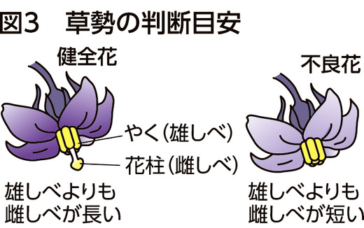 収穫が始まる頃からマルチフィルムの裾をめくって、1㎡当たり化成肥料50g程度を株元にまき、土寄せします。その後、2週間置きに畝の裾に同量を収穫中休みなく与えます。草勢の判断目安は、健全な花は花柱(雌しべ)がやく(雄しべ)の上に出ている状態です(図3)。また、みずみずしいナスを採るには、十分なかん水が必要で、特に高温乾燥期には毎日かん水します。