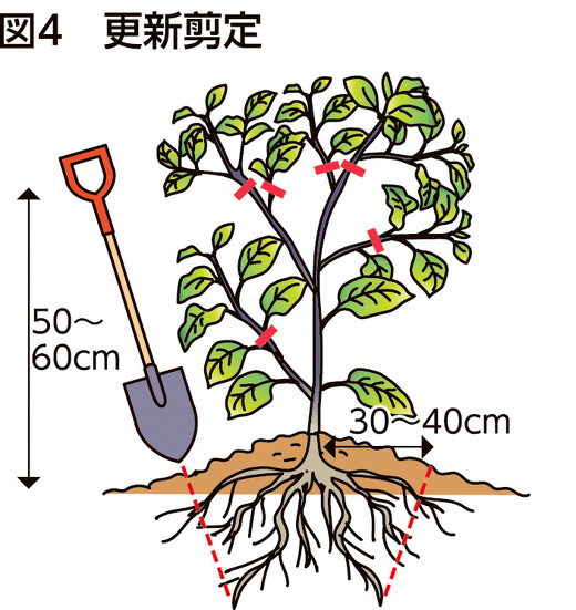 中間地では盛夏(7月中旬~8月上旬)になると、枝が込み合い、葉が茂って果実への日当たりが悪くなってきます。この頃に全体の3分の1~2分の1の枝を切り詰める剪定を行い、追肥をして十分な灌水をします(図4)。約1カ月後に良い秋ナスが収穫できます。