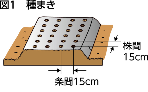 温暖地では1~2月から種まきができますが、家庭菜園では3月まきが安心です。穴開きマルチでは、1穴に5~6粒まきます(図1)。