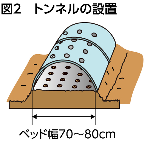 換気作業を省力化するには穴開きのトンネル資材(農ポリ)を選ぶと良いのですが(図2)、普通の農ポリでは生育に従って裾を上げて換気をします。さらに、トンネル内の茎葉が茂り、いっぱいになればトンネルを外します。