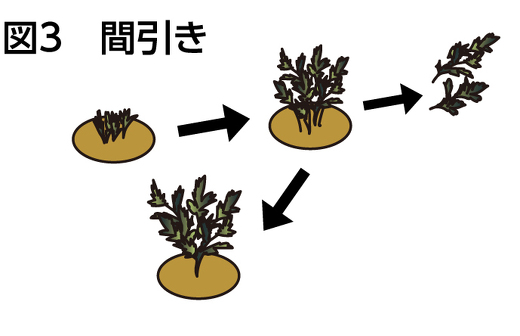 1回目は本葉2~3枚のときに2~3本、2回目は5~6枚のときに一本立ちにします(図3)。