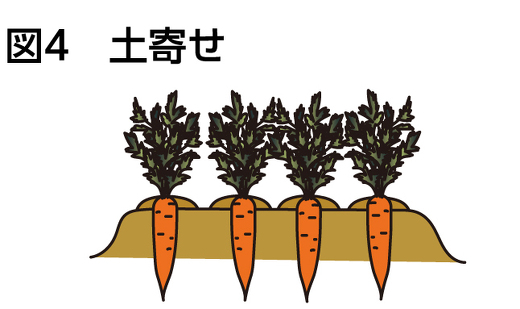 間引きと同時に土寄せを行い、さらに収穫期近くには、根の肩の部分にさらに土寄せして、根が緑に着色するのを防ぎます(図4)。