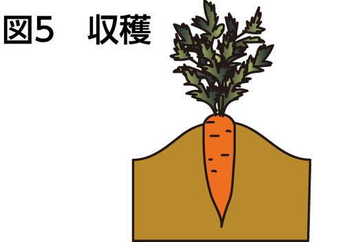 根の径が4~5cmに肥大した株から順次抜き取ります。太り過ぎて裂根しないうちに収穫をします(図5)。裂根は急激に肥大する生育後半、畑が乾燥または過湿となる水分条件で起きやすいものです。