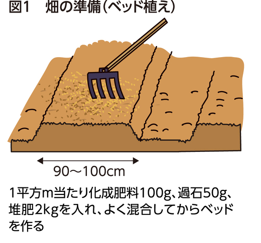 植え付けの2週間前に、1㎡当たり苦土石灰100gを散布してよく耕しておきます。1週間前に化成肥料(N-P-K=15-15-15%)100g、過リン酸石灰(過石)50g、堆肥2kgを全面にまき、深さは20cmくらいに耕します。ベッド植え(4条植え)にする場合は幅90~100cmの栽培床を作ります(図1)。