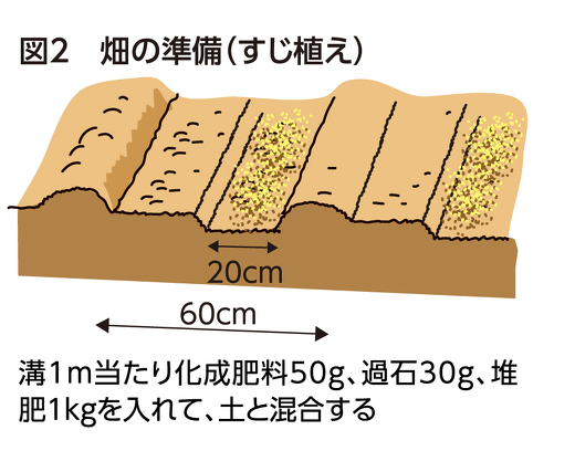 すじ植え(1条植え)では、畝幅60cmとし、幅20cmの溝を掘り、畝1m当たり化成肥料50g、過石30g、堆肥1kgを入れて、土とよく混ぜておきます(図2)。