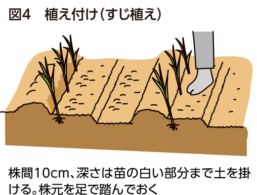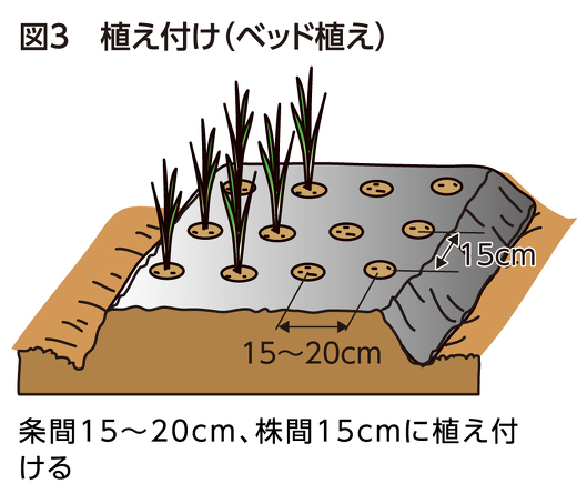 11月に入ると園芸店で苗の販売が始まります。草丈20~25cm、太さ5mm程度の苗を購入し、霜の降りる前までに植え付けると良いでしょう。ベッド植えでは、黒ポリマルチを張れば雑草が抑えられ、地温を上げて生育が良くなります(マルチ栽培)。穴開きマルチを使う場合は穴の規格に応じて、条間15~20cm、株間15cmに植えます(図3)。