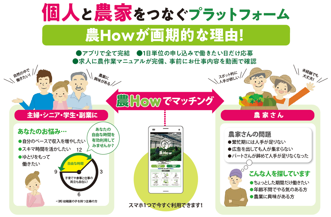 JAグループが提携しているバイトアプリ「農How」は、農家の「繁忙期だけ人手が欲しい」という要望と、働き手の「スキマ時間で働きたい」という要望に対応したサービスであり、農家の1日単位の求人に対し、働き手がスマートフォンのアプリで応募してマッチングできます。