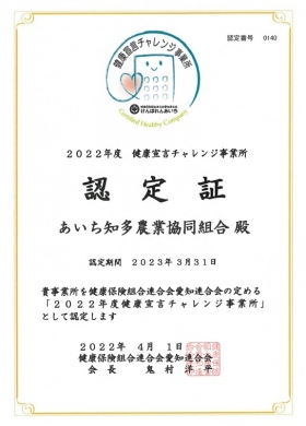 令和4年4月、JAあいち知多は、健康保険組合連合会愛知連合会より「2022年度健康宣言チャレンジ事業所」として認定され、認定証をいただきました。