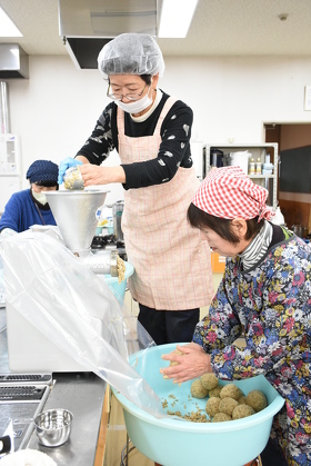 2月1日には、7人の部員が協力しながら手作りのみそを仕込みました。みその材料は、大豆、米こうじ、塩。赤みそにはこれに加え、豆こうじが入ります。参加した部員は前々日から水につけた大豆を大きな圧力鍋で煮てやわらかくしてからこうじと塩を混ぜ、機械でミンチ状にし、みその素になるみそ種を作ると、丸めて容器に投げつけるように詰めていきました。中には大豆から自分で育てている部員もおり、茶豆や黒豆など好みの豆を使って「おいしくなーれ、おいしくなーれ」とおまじないをしながらそれぞれみそを仕込みました。毎年みそを仕込んでいるという部員は「手作りのみそは本当においしい」「9月頃から少しずつ食べ始め、ちょうど1年で食べきってしまうので毎年作らなければ」と話し、手作りのみそを存分に楽しんでいます。