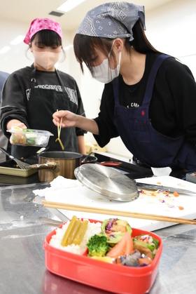 3月22日には、地域農業の理解やチームビルディングによる仕事の進め方の習得を目的として、知多半島の特産品であるフキ・タマネギを使った弁当作りを行いました。3~4人のチームでテーマに基づいたメニューを考案し、手順や担当などを決めてお互いに協力しながら調理を進めました。