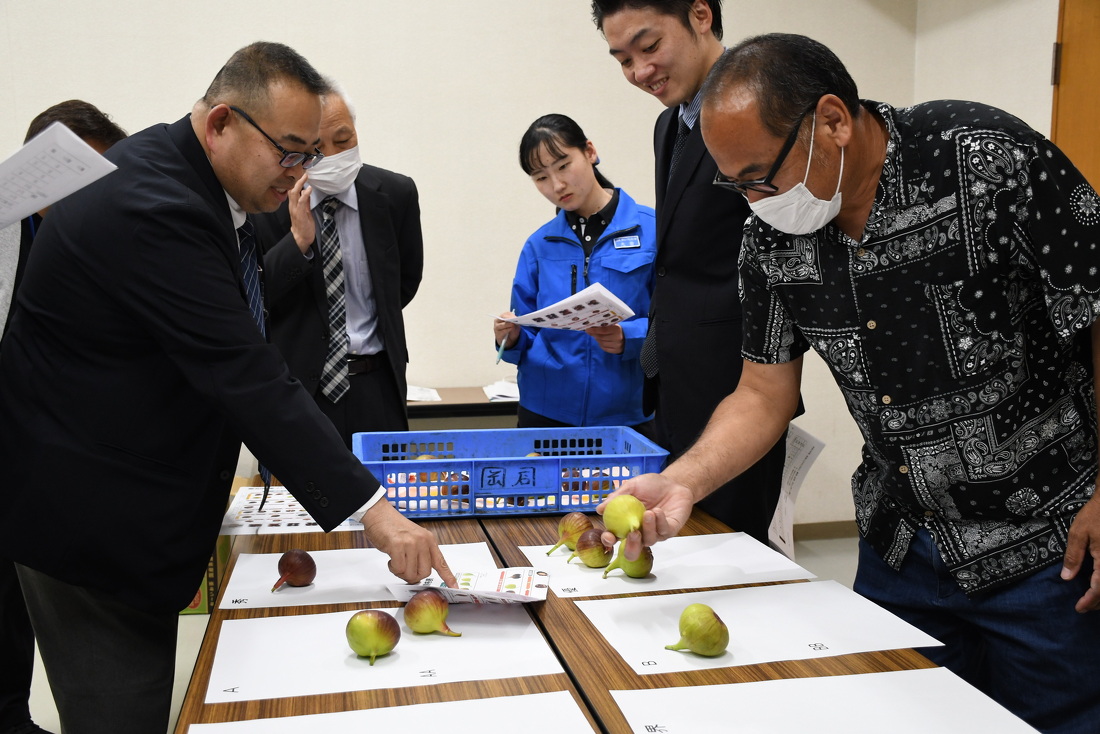 目ぞろえ会ではハウスイチジクの本格出荷を前に、着色や形状、割れ具合などの選別基準を実物を見ながら確認しました。