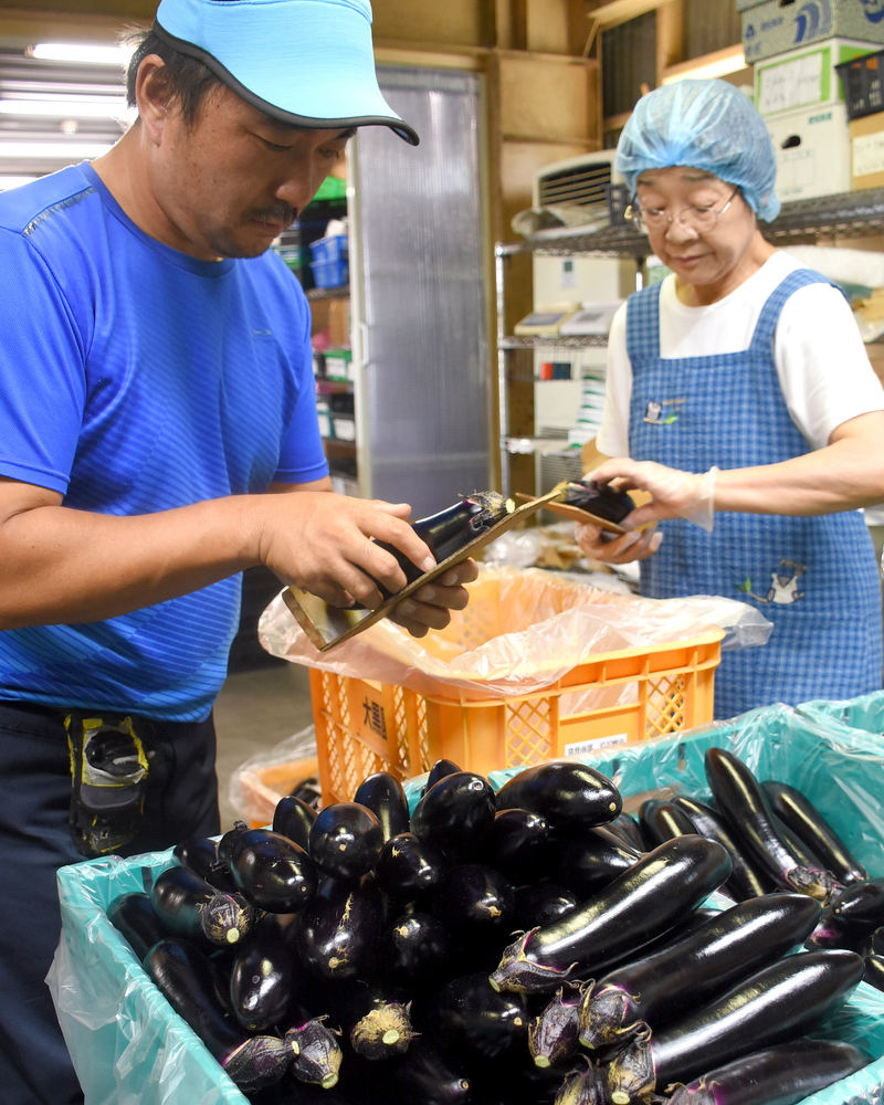 JAあいち知多阿久比なす部会は7月2日、露地ナスの共同選果をスタートしました。出荷初日のこの日は13戸の生産農家が持ち込んだナス550キロを担当者らが大きさや曲がり、傷の有無などの基準確認し、選別して名古屋へ出荷。同JAの統一ブランド「知多どれ」のナスとして、9月下旬までに40トンの出荷を見込んでいます。