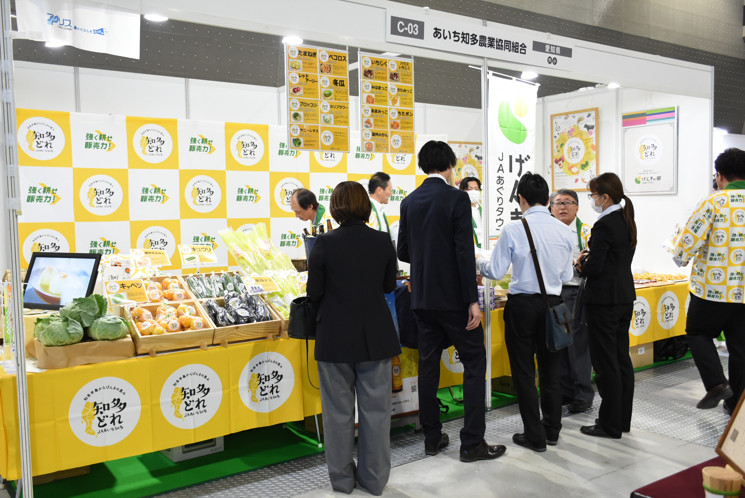 知多米、フキ、キャベツ、ミカン、キュウリ、ナスなどの知多どれ農産物をはじめ、知多米ビールや知多どれバームクーヘン、せんべい、知多牛カレーなどの加工品を子会社のげんきの郷と共同でPRしました。