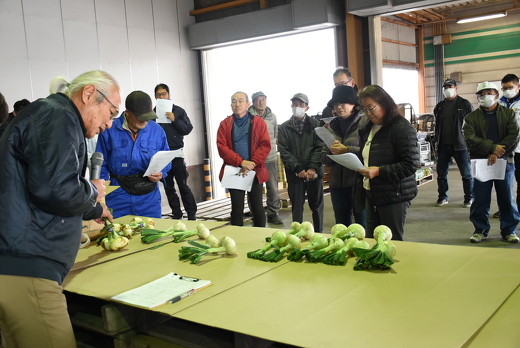 初出荷の同日には、目ぞろえ会も開かれ、生産者や関係者らが選別基準や出荷規格を確認しました。